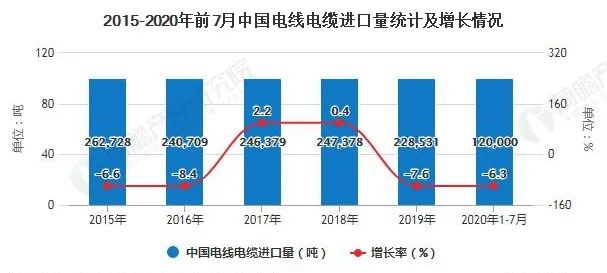 2015-2019年5年間我國電線電纜進口量從26萬噸降至23萬噸,截止至2020年1-7月進口量為12噸,同比下降6.3%,隨著行業進口量的進一步下降,電線電纜將迎來新的發展。