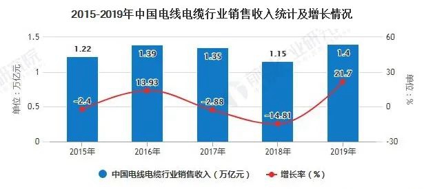 數據顯示,2015-2019年我國電線電纜銷售收入總體呈增長態勢,2019年中國電線電纜行業銷售收入達到1.4萬億元,同比增長21.70%。隨著電線電纜行業規模將不斷增加,電線電纜市場發展前景廣闊。